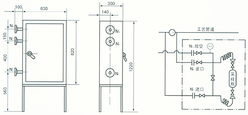 ④SCXL—Ⅱ气体在线式采样器■适用范围:适用于无颗粒、不凝结、不结晶的各种气体介质的采样。 使用温度:-20—425℃,工作压力:0-6.4Mpa■使用方法: (1)先将贮气袋的采气接管插入采样器的采气接头中
